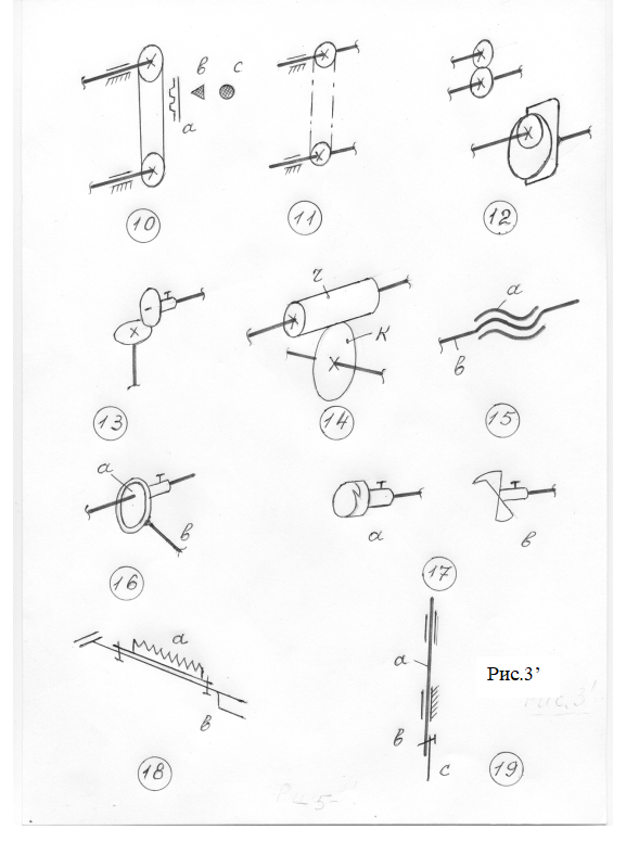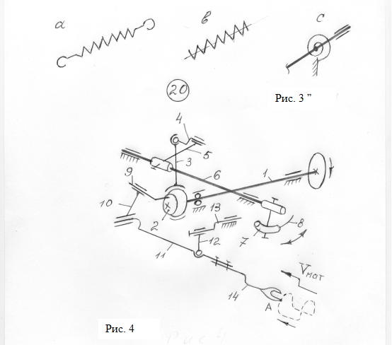 Для упрощения представления устройства сложных швейных машин и их механизмов приняты условные упрощенные обозначения их звеньев и деталей на уровне рекомендаций, но не ГОСТ'а, рис. 3, 3’, 3’’ на которых кружками обозначены порядковые номера показанных элементов: