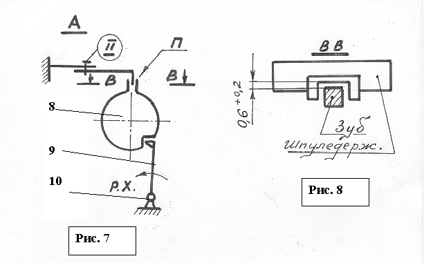 · Поворотом отводчика на валу добиться зазора 0,1…0,3 мм между зубом установочного пальца ,рис. 8, и правой стенкой открытого паза “П” шпуледержателя 8, когда отводчик занимает крайнее левое положение, рис.7.