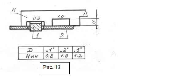 3. Калибром «К» нажатием на рейку 1 сверху выставить размер «Н», рис. 13. ( На рисунке на калибре «К» выбиты значения «Н» в «мм» для каждого « D”, а поз. 2 обозначает игольную пластинку).