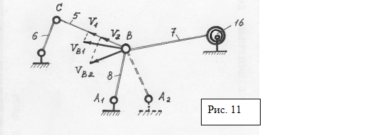 Однако, если рычаг 9 нажать вниз до упора, то точка А1 займёт положение над линией шатуна 7 и при его перемещении влево, как видно из рисунка 11, проекция скорости точки В на направление ВС изменит своё направление на обратное. Произойдёт подача материала к работнице, будет выполняться закрепка. В новом положении точки А также можно регулировать длину стежка.