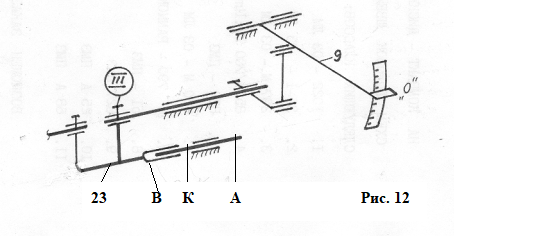 На рисунке 11 представлен вид слева вдоль нижнего вала на цепь продольных перемещений зубчатой рейки с охранением обозначений звеньев рисунка 9.