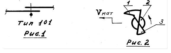 1.1 С вращающимся петлителем, тип стежка 101, рисунки 1 и 2, на котором поз. 1,2. и 3 представляют соответственно носик вращающегося петлителя, шайбу и лопасть. Vмат – направление подачи материала с остановками. Классы машин: 28 ПМЗ, 2222 ОЗЛМ.