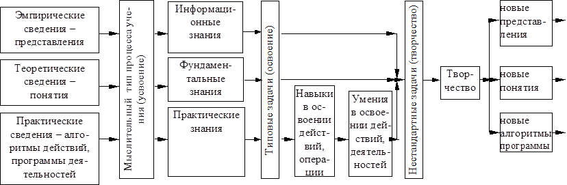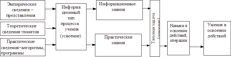 Сведения, перешедшие во внутренний психический план субъекта, в его психику, усвоенные субъектом учения становятся его знаниями, представляющие собой, несмотря на все их терминологическое разнообразие, систему из трех элементов знаний: