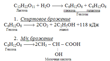 К основным биохимическим процессам при производстве продуктов относят расщепление молочного сахара при молочно-кислом брожении. При производстве к/м продуктов в пастеризованное молоко вносят закваску молочно-кислых бактерий. В состав их взависимости от вида продуктов входят м/к стрептококки и палочки, продуцирующие при сбраживании молочный сахар, молочную кисло. Развитие м/о способствует обогащению к/м продуктов витаминами. При выработке к/м продуктов сбраживается только часть молочного сахара, т.к. при нарастании кислотности в жизнедеятельности бактерий уменьшается, и разложение молочного сахара сильно замедляется или прекращается. Спиртовое брожение при выработке кефира и кумыса вызывают молочные дрожжи.