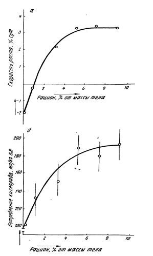 Представление о зависимости между ростом рыб, пищевым рационом и потреблением кислорода можно получить из рис. 1. Потребление кислорода карпами массой 50 г при температуре 23 °С резко возрастает при увеличении рациона только до 5-б % от массы рыб в день, а скорость роста до рациона 5 %. Это дает основание сделать вывод, что пища эффективно используется в организме рыб, если ее поступление в организм не превышает 5 % от его массы. Далее энергия и пластический материал используются только на переработку поступающих избытков пищи.