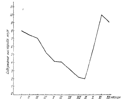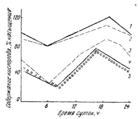 Рис. 3. Типовое содержание кислорода в воде выросгных прудов (по В. Акимову, 1990).