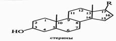 Стеарины – алициклические вещества, входящие в группу стероидов, овычно они представляют собой кристаллические одноатомные спирты (стеролы) или их эфиры (стериды). Различают зоостерины, выделяемые из животных объектов, фитостерины (из ратсений), микостерины, выделяемые из грибов. Стерины имеют в своей основе структуру пергидроциклопентанофенантрена