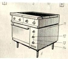 Жарочный шкаф плиты представляет собой камеру из двух стальных коробов, пространство между которыми заполнено теплоизоляционным материалом – алюминиевой фольгой. Дверка шкафа с пружиной и смотровым окном. В камере имеется освещение, что позволяет не открывая дверки, следить за процессом приготовления изделий. Нагрев шкафа осуществляется тэнами, расположенными по три сверху и три снизу. Нижние тэны закрыты подовым листом. Регулирование мощности шкафа осуществляется с помощью двух переключателей (1- для верхних, - для нижних тэнов). Температура в шкафу поддерживается автоматически терморегулятором.