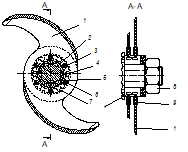 К крышке прикреплены скребки 6, направляющие продукт под комплект серповидных ножей, закрепленных в ножевой головке (рис. 2).