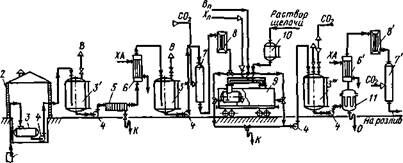 Забор природной минеральной воды из буровой скважины 1 осуществляют специальным каптажным устройством, после чего ее направляют в цистерны 3 прикаптажного помещения 2. Центробежным насосом 4 воду подают в сборник 3', затем направляют на фильтрование в рамный фильтр-пресс 5. Осадки и грязные воды идут в канализационные системы, а чистая минерализованная вода охлаждается в теплообменнике 6 и далее направляется в сборник 3”’. Из последнего сборника она поступает в сатуратор 7. Насыщенная диоксидом углерода вода затем проходит антисептирование в бактерицидной установке 8 под действием ультрафиолетового излучения. Подготовленную таким способом минеральную воду подают в специальный железнодорожный вагон-цистерну 9 для транспортирования на завод, где осуществляется розлив минеральных вод в бутылки. Железнодорожная цистерна перед приемом минеральной воды тщательно обрабатывается раствором щелочи из сборника 10, хлором и промывается питьевой водой во избежание инфицирования продукции. В ряде случаев цехи розлива расположены на небольшом расстоянии от каптажной и подготовительной станций. Насос 4 подает обработанную минеральную воду из цистерны 9 в сборник 3'".