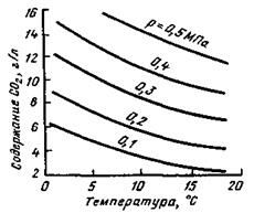 Растворимость диоксида углерода в воде увеличивается с понижением температуры и повышением давления (рис. 5). Поэтому перед сатурацией воду охлаждают до 2...5 °С; процесс сатурации ведут при давлении 0,4...0,7 МПа.