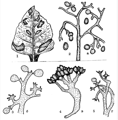 2,3,4,5 - конидиальное спороношение (конидиеносцы и конидии) ложномучнисторосяных грибов: а - род Peronospora, б - род Plasmopara ; в - род Sclerospora ; г - род Bremia.