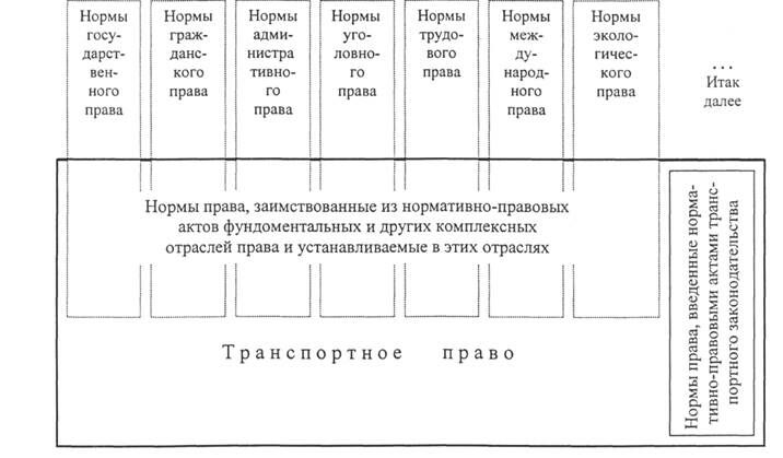 К транспортному законодательству следует отнести соответствующие части нормативных правовых актов, входящих в состав фундаментальных отраслей права, и содержащие нормы права, регулирующие транспортные отношения. В ряде фундаментальных отраслей права транспортные отношения занимают исключительные позиции по частоте их упоминания в текстах нормативных правовых актов. Это в первую очередь относится к административному, гражданскому и уголовному праву.