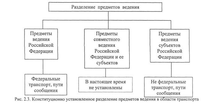 разделение в Конституции предметов ведения в области транспорта между Российской Федерацией и ее субъектами. Российская Федерация обладает всей полнотой государственной власти только в отношении федеральных транспорта и путей сообщения. Предметы совместного ведения Российской Федерации и ее субъектов в области транспорта не установлены;