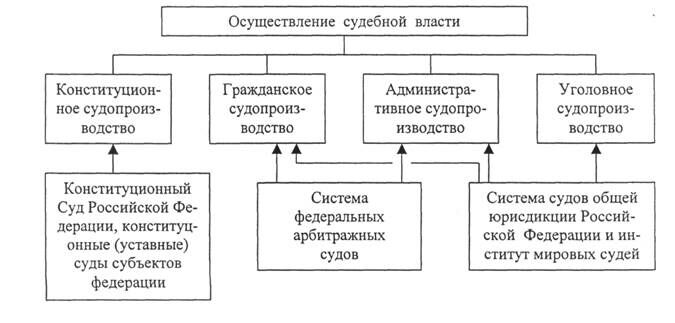 Государственное право определяет общую организацию судебной власти. Судебная власть в Российской Федерации функционирует в соответствии с гл.7 Конституции и рядом федеральных законов, а также законов субъектов федерации. «Судебная власть осуществляется посредством конституционного, гражданского, административного и уголовного судопроизводства» (статья 118 Конституции) (рис. 2.4). Система судов включает суды федеральные (основная часть судебной системы) и суды субъектов федерации. Суды субъектов разбирают дела, касающиеся вопросов конституционного (уставного) права субъектов, а также включают вновь формируемый ныне институт мировых судей. Судебные органы специализированы на конституционном (уставном), общем и арбитражном судопроизводстве.