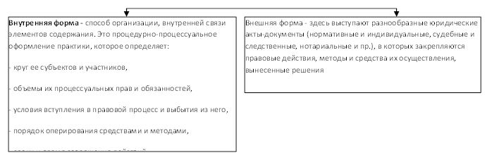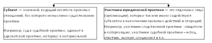 Таким образом, юридическая практика — это деятельность по изданию (толкованию, реализации и т. п.) юридических предписаний, взятая в единстве с накопленным социально-правовым опытом.