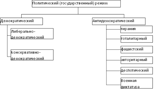 Демократический режим знает различные формы: либерально-демократический, консервативно-демократический режимы.