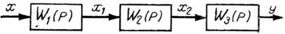 Последовательное соединение. Рассмотрим цепочку, состоящую из трех последовательно соединенных звеньев (рис. 35). На вход первого звена поступает величина х, а на выход последнего — у. Результирующая передаточная функция при последовательном соединении звеньев равна произведению передаточных функций отдельных звеньев: