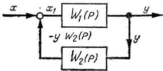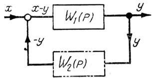 Случай противоположного направления сигналов (охват звена обратной связью) представлен на рис. 37. При включении обратной связи входной сигнал х алгебраически суммируется с сигналом, прошедшим через звено обратной связи, и при отрицательной обратной связи он равен:
