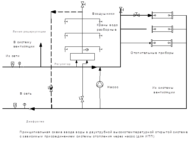 Системы отопления и вентиляции общественных зданий с тепловым потоком на вентиляцию менее 0,5 МВт рекомендуется присоединять к двухтрубным тепловым сетям также по зависимой схеме.