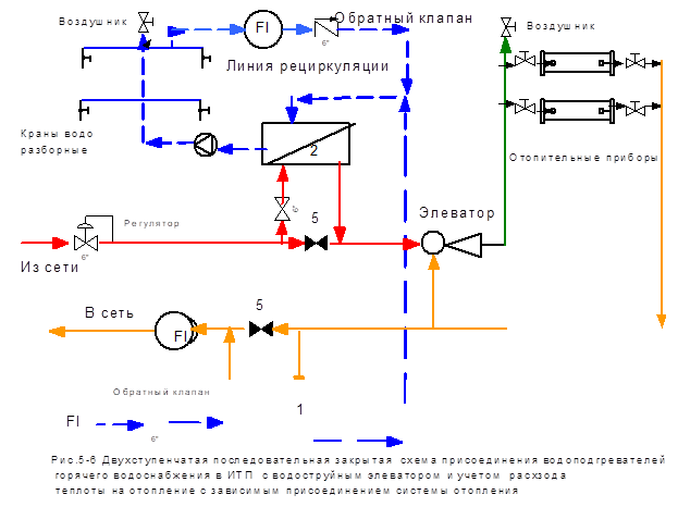 2. по зависимой схеме через элеватор (рис 2) при необходимости снижения температуры воды у потребителя и располагаемом напоре перед элеватором, достаточном для его работы,