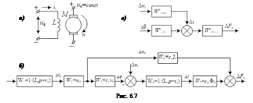 Для двигателя независимого возбуждения, регулируемого по цепи возбуждения (рис. 6.7а), процессы описываются системой уравнений в отклонениях: