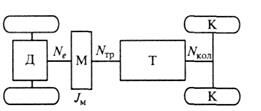 Рис. 5.1. Схема для определения мощности и крутящего момента, подводимых от двигателя к ведущим колесам автомобиля: Д - двигатель; М — маховик; Т — трансмиссия; К — ведущие колеса