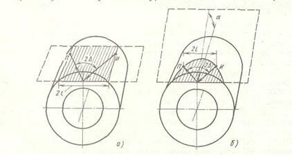 В зависимости от траектории распространения ультразвукового пучка относительно поверхности сканирования, РС-ПЭП типа «Дуэт» называют хордовыми и угловыми (рис. 9.9, а, б). Применение хордовых РС-ПЭП возможно только для контроля изделий с большой кривизной поверхности (прежде всего труб с диаметром