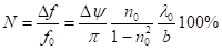 Рис. 68. Зависимость относительной полосы пропускания от относительной толщины гладкой линзы (сплошная кривая) и от числа ступеней зонированной линзы (пунктир).