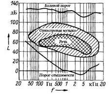 | Рис. 7. Динамический диапазон сигналов речи и оркестра как функция частоты |