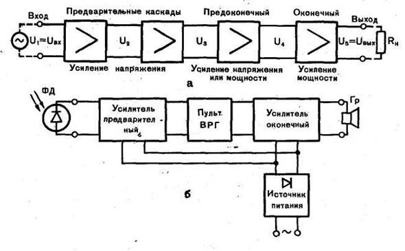 Рассмотрим упрощенную структурную схему усилителя — схему соединения его каскадов (рис. 1а). Обычно усиление сигнала, создаваемое одним каскадом, оказывается недостаточным; поэтому применяют многокаскадные схемы усилителей.