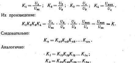 Для многокаскадного усилителя коэффициент усиления равен произведению коэффициентов усиления его каскадов: