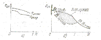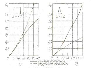 на ЭВМ зависимости коэффициента нормальной силы сУ oт угла атаки a для случаев “вредного срыва” (рис. 9.17 а, прямоугольное крыло, l =1) и “полезного срыва” (рис.9.17 б, треугольное крыло,l =1). Штриховыми линиями показаны данные для бессрывного обтекания ,сплошными — для срывного.
