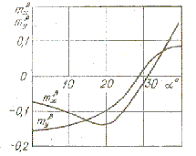 Срыв потока и образование вихрей значительно изменяют боковые моментные характеристики. На больших углах атаки существенно уменьшаются по абсолютной величине и даже могут поменять знак производные mx b и my b(рис. 9.21). Происходит это по ряду причин.