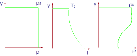 Давление по толщине пограничного слоя изменяется незначительно и его принимают постоянным. Температура по мере приближения к поверхности возрастает в силу торможения потока, а плотность поэтому уменьшается.