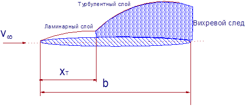 Зона перехода ламинарного ПС в турбулентный в силу ее малости заменяется точкой. Ее координата относительно носка тела обозначается хт.