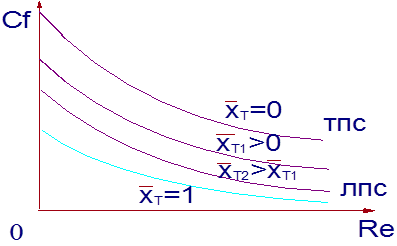 В случае смешанного пограничного слоя на поверхности пластины коэффициент трения зависит не только от числа Rе, но и от координаты точки перехода (рис.1.32). Заметим, что зависимость Сf (Rе) при хт=1 соответствует полностью ламинарному пограничному слою, а при хт=0 - полностью турбулентному.