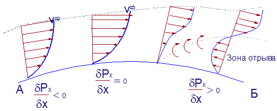 Когда градиент давления становится положительным (задний скат профиля), то частицы в пограничном слое движутся из области меньшего давления в область более высокого давления, т.е. разность давлений действует против движения частиц и поток тормозится. Часть пограничного слоя, расположенная непосредственно у поверхности тела, обладает минимальной кинетической энергией и при некотором значении