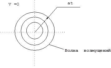 Если источник находится в невозмущенной среде (V=0), то возмущения от него распространяются со скоростью звука в виде сферических волн равномерно во все стороны (рис.1.34).