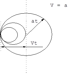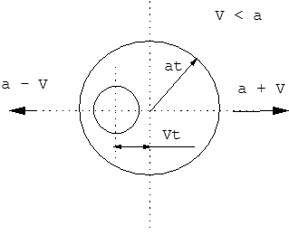 Через время t изменения давления и плотности достигают поверхности сферы с радиусом at. Если источник возмущений находится в потоке, движущимся со скоростью V < a, то центры сферических волн будут сноситься потоком со скоростью V. Возмущенная область распространяется по потоку со скоростью V+a, а против потока - со скоростью a-V