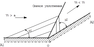 Рассмотрим физическую сущность образования скачка уплотнения на примере обтекания сверхзвуковым потоком внутреннего тупого угла (рис.1.38).