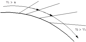 Из рассмотрения физической природы возникновения скачков уплотнения вытекает утверждение о невозможности образования скачка разрежения, так как при обтекании сверхзвуковым потоком выпуклой поверхности (рис.1.87), т.е. при его расширении, когда по потоку скорость возрастает, а давление падает, характеристики, исходящие от поверхности, не пересекаются, а расходятся веером (V