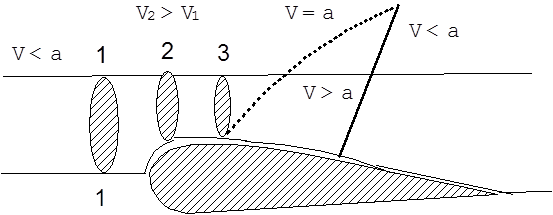 Вследствие деформации струйки верхней поверхностью профиля скорость в ней возрастает от дозвуковой (сечения 1 и 2) до равной скорости звука в критическом сечении 3, а далее до сверхзвуковой на некотором участке расширения струйки. Но, так как за телом поток дозвуковой, то сверхзвуковой поток должен затормозиться до дозвукового, а это может произойти только на скачке уплотнения.