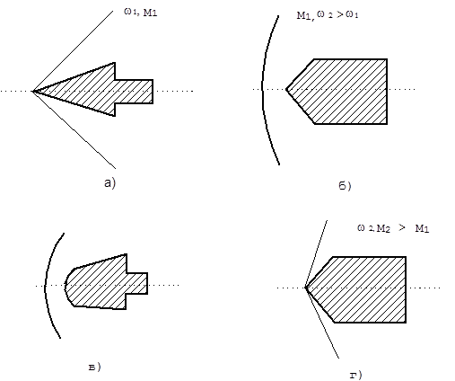 макс для данного числа М скачок отходит от тела и становится криволинейным (рис.1.41 б). Аналогичную форму скачок имеет и в случае затупленной формы носовой части (рис.1.41 в).