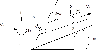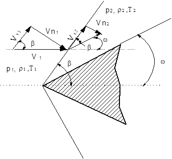 Предварительно получив основные кинематические связи для скачка, т.е. соотношения составляющих скорости потока. Условимся параметры до скачка обозначать индексом "1", а после скачка - индексом "2".