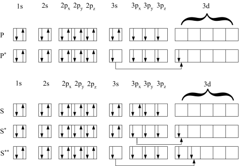 Рис. 1.10. Квантовые ячейки атомов фосфора (Р, Р*) и серы (S, S*, S**) в основном состоянии (P, S) и при возбуждении (P*, S*, S**)