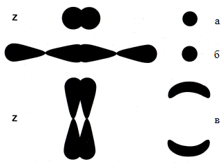 Молекулярные σ-орбитали создаются при перекрытии двух s-орбиталей (рис. 1.11, а), s – и р-орбиталей, двух р-орбиталей на оси Z, вдоль которой два атома взаимодействуют друг с другом (рис. 1.11, б)