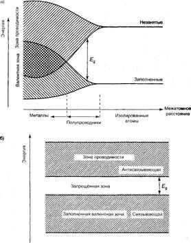 Различие между названными типами материалов проявляется в том, как в них образуются энергетические уровни. Молекулярное строение неметаллов отличается тем, что атомы в них образуют дискретные связывающие и антисвязывающие молекулярные орбитали. На связывающих орбиталях располагаются электроны, принимающие участие в образовании химической связи. Попасть на несвязывающую орбиталь (не занятую в устойчивом состоянии молекулы) электрон может только при возбуждении. Пространство между орбиталями не может быть занято ни при каких обстоятельствах — это так называемая «запрещенная» зона. В металлах, напротив, энергетические зоны перекрываются, и запрещенных зон не существует. Электроны в металлах могут свободно перемещаться между зонами, что и объясняет их высокую электронную проводимость. В полупроводниках имеются две энергетические зоны: нижняя зона, называемая валентной зоной (ВЗ), и верхняя, называемая «свободной» или зоной проводимости (ЗП). Между ними располагается запрещенная зона (рис. 2.1).