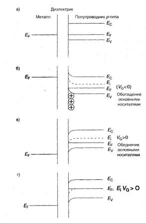 обеднение граничной области дырками (рис. 2.2в). В этом случае  компенсаторный эффект приводит к тому, что ВЗ и ЗП у границы раздела загибаются вниз. При дальнейшем увеличении VG концентрации электронов и дырок вблизи границы могут выровняться, и уровень Ферми опять окажется ровно посередине между ВЗ и ЗП (как и в отсутствие напряжения). Дальнейшее увеличение VG  приведет к инверсии типа проводимости от р-типа к n-типу. Напряжение, при котором происходит инверсия, называется пороговым (VT).