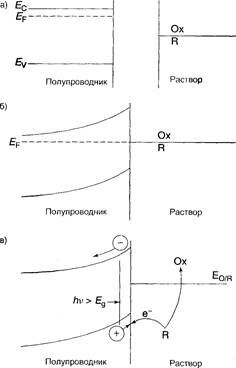 Ox—R: а) до контакта; б) в равновесии в темноте; в) после